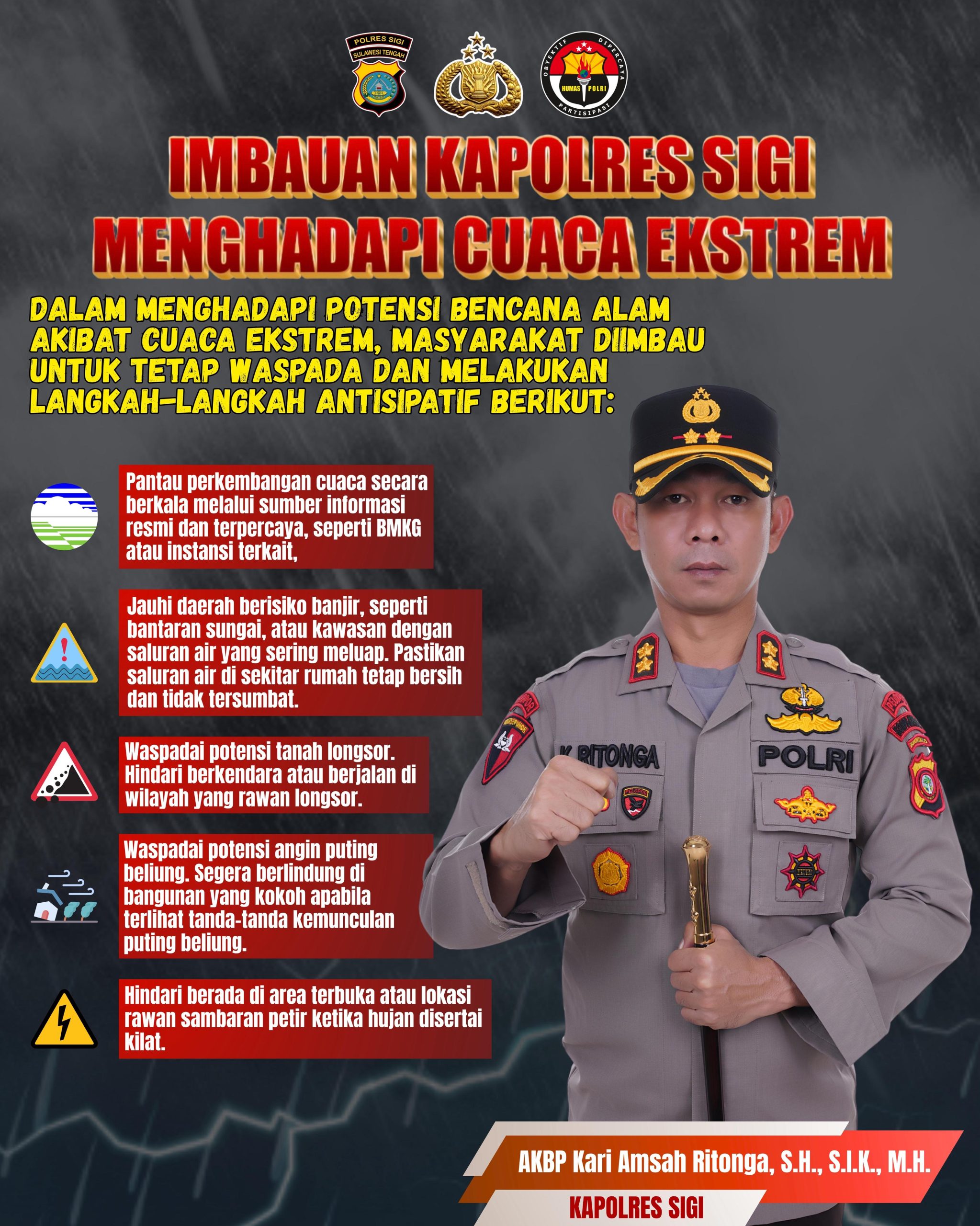 Polres Sigi mengimbau masyarakat untuk terus mengikuti informasi resmi dari BMKG dan BPBD, menjaga kebersihan saluran air agar tidak tersumbat, serta menyiapkan perlengkapan dasar seperti dokumen penting, obat-obatan, senter, air bersih, dan makanan ringan. Setiap keluarga juga diharapkan mengetahui lokasi aman atau titik kumpul terdekat sebagai langkah antisipatif.