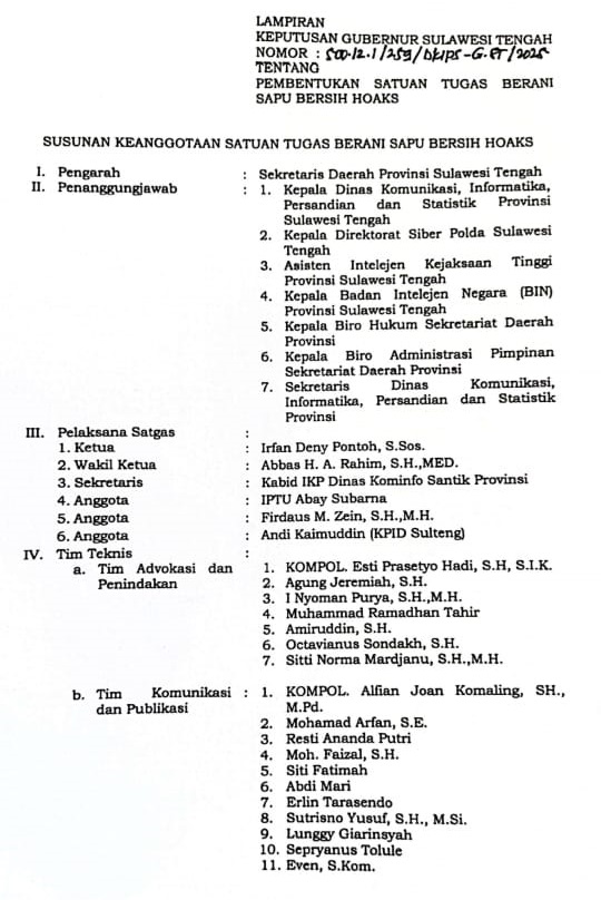 Polemik pencantuman nama tanpa konfirmasi ini menambah daftar pertanyaan publik terkait transparansi, mekanisme kerja, serta akuntabilitas pembentukan Satgas Berani Saber Hoaks di Sulawesi Tengah, terlebih menyangkut kebebasan pers dan profesionalisme jurnalisme.